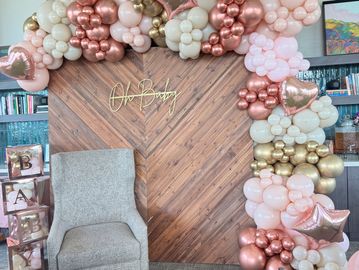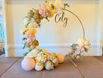 Introducing our premium package complete with a custom sign, 14ft of balloons in up to four colors, starting at $550 before delivery and installation. This impressive set is a stunning statement piece that guarantees to wow your guests and create an unforgettable impact. Gold Arch Rental $85