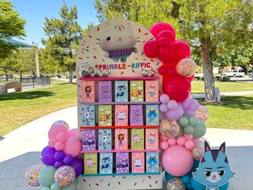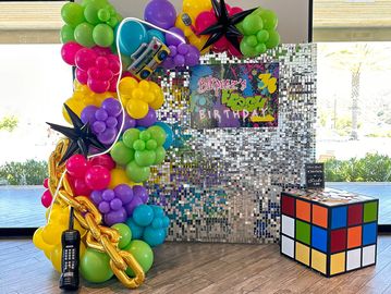 7ft Wall + 6ft Wall + 16 ft of Balloons + Large Vinyl Message and a Cake Stand