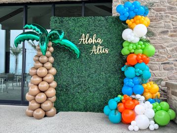 7X7ft Hedge Wall Rental, Custom Sign, 14ft of balloons, and a Cake Stand.